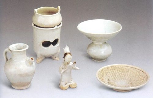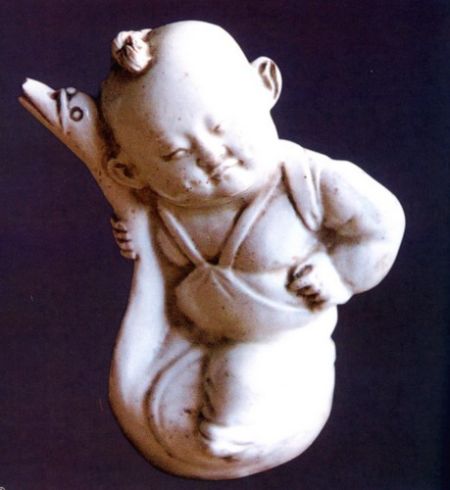 北宋定窯白釉童子抱鵝壺。