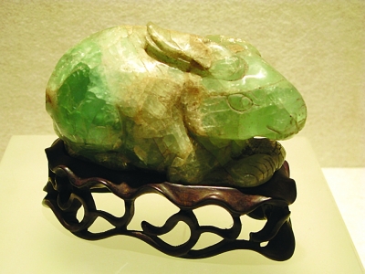 除了玉兔展品外,水晶兔也是展覽的一大亮點(diǎn)。展品中有一件晚清的“水晶兔水注”,完全用天然水晶雕琢而成,小兔蹲伏欲跳,神態(tài)生動(dòng)。這件水晶兔看似是一個(gè)文人用的筆洗,可謂是一件文房珍品。前面介紹的兔子都是閉嘴的,張開嘴巴,吐著舌頭的極為罕見。記者就看見一只這樣的“水晶兔子”,它體態(tài)肥碩,短尾上翹,奔跑中,不忘豎著一只長(zhǎng)耳,時(shí)刻傾聽周圍的動(dòng)靜。這只兔子磨得非常光滑,不知經(jīng)過(guò)多少文人雅士之手。