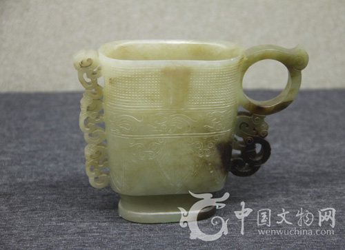 明 青玉螭耳仿古銅紋杯