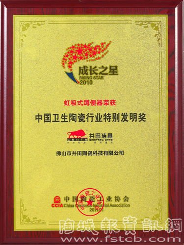 井田潔具又傳佳音,“虹吸式蹲便器”再獲殊榮。2011年1月14日,佛山市井田陶瓷科技有限公司被中國陶瓷工業(yè)協(xié)會授予 “中國衛(wèi)生陶瓷行業(yè)特別發(fā)明獎”,榮獲行業(yè)頂級獎項。得獎產品“虹吸式蹲便器”是井田的“發(fā)明專利產品”、“明星產品”,素有“天下第一蹲”的美譽。