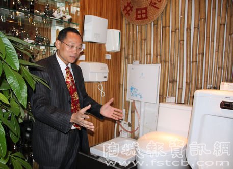 井田潔具總經(jīng)理、“虹吸式蹲便器”發(fā)明者陳小練先生正在講解獲獎產品。