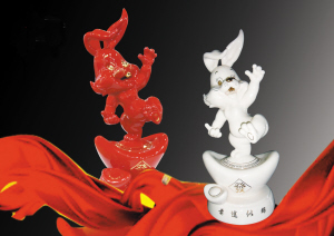 日前,中國·冠福家用上市公司的冠福窯藝術瓷推出了卡通形象的吉祥對兔,作品高37厘米、寬18厘米。造型寓意“前途似錦”。對兔為紅白兩色,手工描金,呈站姿,立于金元寶上,夸張的舞蹈動作,祈求來年風調雨順、吉祥如意。