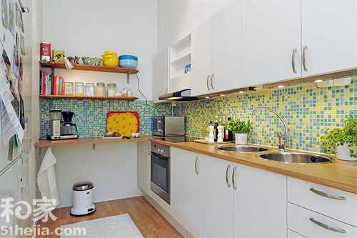 很典型的一個(gè)北歐人家的廚房,但這個(gè)廚房除了簡(jiǎn)約款的櫥柜外最引人注目的當(dāng)屬它的墻面設(shè)計(jì);藍(lán)綠黃三色的馬賽克把廚房空間裝點(diǎn)出清新淡雅的氣息,幾盆綠植點(diǎn)綴,與墻面幾乎溶為一體。