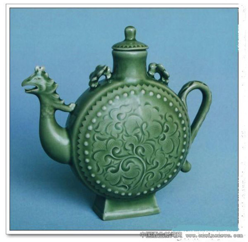 古代的陶瓷酒具,有的還可以展示出一種美妙的藝術(shù)表演,如唐明皇與楊貴妃用的飲酒具,酒杯中就有一個(gè)龍頭,下面用一個(gè)高足盞盤(pán)托著;盞盤(pán)中的一個(gè)凹處可貯酒,陶瓷藝人用水平的原理使龍頭杯中的酒超過(guò)一定水平線時(shí)就會(huì)一下子流進(jìn)盞中的凹處,而酒杯中滴酒不灑。這種巧奪天工之作后來(lái)失傳了,直到20世紀(jì)90年代,浙江龍泉窯才首先試制成功這種酒具,成為廣州出口商品交易會(huì)上一個(gè)絕妙的傳統(tǒng)產(chǎn)品。