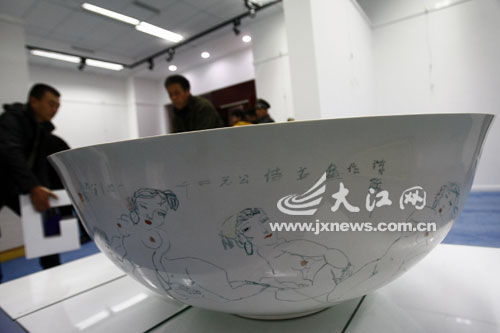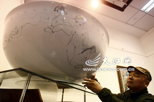 昨日下午,方衛(wèi)國作品運(yùn)抵江南藝術(shù)館,其中包括這個(gè)備受矚目的吉尼斯薄胎碗。方衛(wèi)國告訴記者,這個(gè)薄胎碗是他2008年購買的,碗口寬為1.26米,創(chuàng)下了當(dāng)時(shí)的吉尼斯最大薄胎碗紀(jì)錄。買來后,方衛(wèi)國邀請(qǐng)了著名的老藝術(shù)家陳醉在薄胎碗上作畫,繪畫了17個(gè)沐浴中的婀娜少女。因?yàn)槭潜√ネ,陳醉進(jìn)行的是釉上彩創(chuàng)作,價(jià)值600萬元人民幣。陳醉,曾在江西工作過很長(zhǎng)時(shí)間,現(xiàn)任中國藝術(shù)研究院美術(shù)研究所研究員、教授、博士生導(dǎo)師,中國裸體藝術(shù)研究專家。早在上個(gè)世紀(jì)80年代,他就潛心于當(dāng)時(shí)還是“禁區(qū)”的裸體藝術(shù)的研究。代表作《裸體藝術(shù)論》為我國第一部有關(guān)的學(xué)術(shù)專著,有關(guān)學(xué)者對(duì)專著予以高度肯定與贊揚(yáng),認(rèn)為是具有“填補(bǔ)空白”、開拓領(lǐng)域的里程碑意義的研究成果,在中國現(xiàn)代美術(shù)史及至文化史上都具有特殊意義。