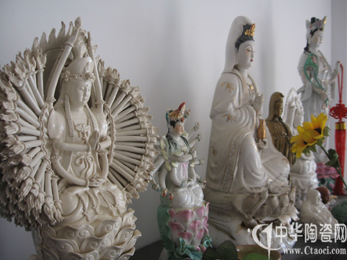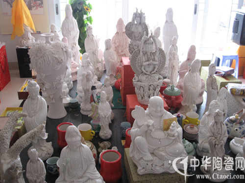最近,德化興起了多位專項收藏愛好者。我們聞訊趕到鄭先生的住所,一走進客廳,只見整齊有序地擺列著各式各樣的瓷塑觀音,五彩繽紛、千姿百態(tài),不禁令人眼前一亮。