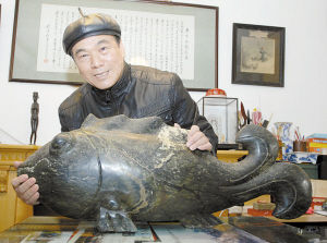 漸漸地,王曉海對“華夏魚文化”收藏的熱愛在全國都有了名氣,大家知道哪里有這樣的古玩都會來告訴他,不少人還會親自給他送過來。幾年前,王曉海應(yīng)邀去象山考察,一位70多歲的漁老大聽說他的名聲后,就特意把家中一尊供奉了幾代的“鎮(zhèn)宅之寶”魚龍石雕贈送給了他。
