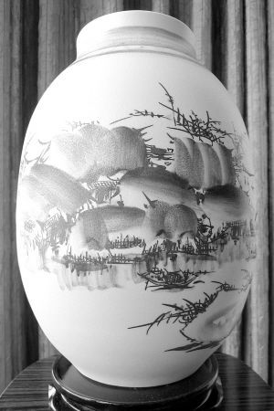 中國工藝美術(shù)學(xué)會(huì)會(huì)員、江西省高級(jí)工藝美術(shù)師方黎波2009年創(chuàng)作的瓷瓶《春江水暖》(李力 攝)