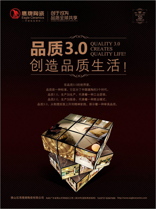 正是鷹牌陶瓷擁有如此卓越的品牌品質(zhì)、產(chǎn)品品質(zhì)和服務(wù)品質(zhì),品質(zhì)3.0應(yīng)運而生,為中國陶瓷行業(yè)帶來全新的品質(zhì)思想,以大浪潮的姿態(tài)引領(lǐng)陶瓷行業(yè)品質(zhì)全面升級。但是品質(zhì)3.0絕不是鷹牌陶瓷品質(zhì)發(fā)展的終點,率先進入品質(zhì)3.0時代的鷹牌陶瓷,勢必以更嚴格的要求來加強自身品質(zhì)建設(shè),時刻謹記創(chuàng)新與承諾,以行業(yè)領(lǐng)跑者的姿態(tài)站在行業(yè)發(fā)展的最前端,大膽接受市場的考驗,從企業(yè)的各個細節(jié)方面做到盡善盡美,成為具有高含金量的品牌,高技術(shù)含量的產(chǎn)品,高附加值的服務(wù)的品質(zhì)企業(yè),去迎接品質(zhì)發(fā)展的另一座高峰,為消費者構(gòu)建高貴品位的品質(zhì)生活,推動中國家居文化和價值觀的品質(zhì)演進。