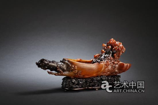 翻閱古今文獻(xiàn)著錄可知,盡管犀角制品的使用歷史悠久,但隨著犀角資源的稀缺,其使用權(quán)一直被皇戚貴族控制著,早在商周、漢朝時(shí)期,犀角已是進(jìn)貢皇帝的寶物,明朝時(shí)更是將其列為珍寶類(lèi)藝術(shù)品,甚至被統(tǒng)治者用作等級(jí)制度的象征。近些年隨著犀牛被列為世界珍稀保護(hù)野生動(dòng)物,犀角制品日益稀缺,加之收藏作為人們的一種高雅的消遣和投資理財(cái)活動(dòng)已日趨普遍,業(yè)余收藏愛(ài)好者數(shù)量不斷擴(kuò)大,其收藏的品種和門(mén)類(lèi)也在不斷增多,包括角雕在內(nèi)的一些過(guò)去十分難得一見(jiàn)的高貴工藝美術(shù)品,現(xiàn)在終于有人敢于問(wèn)津,故而愈顯犀角雕刻藝術(shù)的瑰麗之妍。本展覽中最引人關(guān)注的便是那些題材較為罕見(jiàn)的作品,如明代犀角雕百子圖杯便是一例。此器體量頗巨,精工細(xì)雕,敞口斂足,自然的弧度盡展犀角之原美,通體采用深淺浮雕、鏤雕技法雕刻出“百子嬉戲圖”,眾小兒在山林幽壑間嬉鬧追逐,其憨狀可掬,神情栩栩如生,此題材寄寓了人們對(duì)百子千孫的愿望,更體現(xiàn)了儒家詩(shī)禮傳家的傳統(tǒng)思想。而另一件犀角雕鮑天成作張騫泛槎器不僅雕工精美,亦有名家款識(shí),保存至今仍品相完好,于北京故宮博物院及臺(tái)北故宮博物院均有同類(lèi)器物收藏可作參照。除此之外,還有尤侃制犀角雙鷹杯、犀角雕梅花癭木題詩(shī)大杯、山水樓閣人物犀角杯、海水八怪犀角杯等等,營(yíng)造出自然珍禽、詩(shī)書(shū)畫(huà)意、童稚雅趣等不同意境,令人不由稱(chēng)奇。