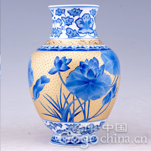 圖:袁述凡手繪青花描金荷花溜肩瓶