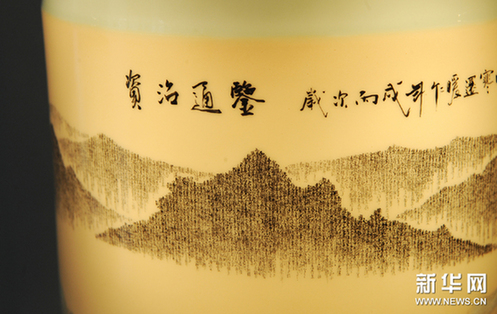 這是3月24日在北京倚林佳園會(huì)所拍攝的王芝文陶瓷微書(shū)作品《資治通鑒》,其中的山水畫(huà)均由微書(shū)(字)組成。