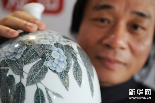 3月24日,在北京倚林佳園會(huì)所,王芝文在展示陶瓷微書(shū)作品《麗影婆娑》,該作品由近十萬(wàn)字組成。