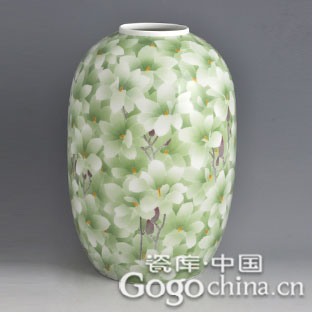釉下金玉滿堂花瓶高30cm,采用釉下分水工藝,高白玉瓷材質(zhì),燈籠瓶型。由陶瓷藝術(shù)大師陳揚(yáng)龍親手繪制。此花瓶采用釉下五彩技藝,收口鼓腹短足,通體繪玉蘭滿花,罩施一層白釉,體形優(yōu)美勻稱,輕盈秀美而不失靈動(dòng)。金玉滿堂花瓶以玉蘭花為題,利用花型的變化,重疊構(gòu)成疏密關(guān)系。通過(guò)色彩的濃淡深淺體現(xiàn)出眾多層次,使畫(huà)面滿而不塞,統(tǒng)一又有變化。滿花花瓣層次分明、清新欲滴,色澤鮮麗逼真、形態(tài)莊重典雅,花瓣格外生動(dòng)逼真,襯托出釉下五彩瓷器特有的高雅品味。金玉滿堂花瓶以玉蘭為寓,寓意收藏者富有而有才干,滿花寓意財(cái)市滿室。一組共紅、紫、灰、綠四只,表現(xiàn)同一畫(huà)面又可用各種單一顏色表現(xiàn)出不同效果。