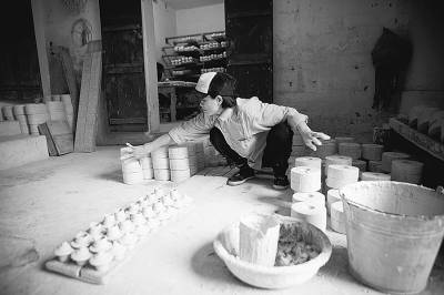 我問司機(jī)可不可以去工廠看看制作過程,他便帶我去他朋友的工廠。這是典型的家庭小作坊,院子有幾排貨架,旁邊有幾個(gè)工人在干活。主人熱情地招呼我們進(jìn)去,從井里提了桶水上來,沏茶給我們喝。他家生產(chǎn)各種可愛的小罐子和杯子,還有各種各樣好玩兒的小擺件。有指甲蓋大小的成套的小茶壺茶杯,有放上水就可以吹響的小鳥哨子玩具等等。每一個(gè)環(huán)節(jié)都有一個(gè)工人在負(fù)責(zé)。經(jīng)過把奶白色的泥漿倒進(jìn)模具里做生坯,曬干,畫坯,上釉,最后燒窯,就可以做成一件完成的瓷器了。