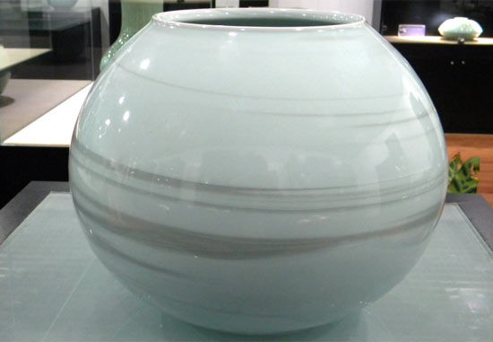 從此次參展的作品來(lái)看,參展作品《天池》采用雙層拉坯法,倒置拉坯成型,器型飽滿厚重,內(nèi)青外白,特殊刀法刻畫(huà)出的流動(dòng)性線條使作品產(chǎn)生旋轉(zhuǎn)中的率動(dòng)性,一弘清泉,浩月在天,動(dòng)與靜的巧妙結(jié)合,使作品具有強(qiáng)烈的視覺(jué)效果和藝術(shù)感染力。《云水》簡(jiǎn)練飽滿,流動(dòng)性的絞胎紋線條粗細(xì)相間,宛如行云流水,構(gòu)成了一幅江南山水畫(huà),作品詩(shī)一般的意境和獨(dú)特的田園風(fēng)情,讓人產(chǎn)生無(wú)限遐想。美輪美奐,比較全面的展示了盧大師近年青瓷藝術(shù)的巨大成就。