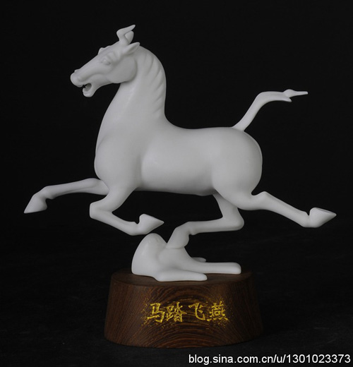 但凡了解瓷塑的人都知道,由于瓷器要經(jīng)過(guò)一千多度高溫的燒煉,最高溫時(shí)的瓷胎會(huì)呈現(xiàn)一種熔融狀態(tài),如果胎體重心不穩(wěn),燒煉中極容易變形甚至癱倒成為廢品,因此瓷塑的底部從工藝角度講,應(yīng)該越敦實(shí)越好。尤其對(duì)馬的四條細(xì)長(zhǎng)腿,瓷塑家都會(huì)盡量避免如實(shí)塑造。難能可貴的是,林建全總是做別人難以做到的事,想別人沒(méi)想到的招。他創(chuàng)作的瓷馬幾乎每匹都四蹄飛揚(yáng)----四只翻飛的馬蹄都交代得清清楚楚,站立得穩(wěn)穩(wěn)當(dāng)當(dāng)!如圖“馬踏飛燕”(見(jiàn)圖),原文物是一件青銅器,青銅質(zhì)材單腿曲立當(dāng)然就沒(méi)有工藝難度,何況不經(jīng)火燒。而這件瓷塑“馬踏飛燕”,造型精準(zhǔn)不說(shuō),居然靠著一條細(xì)而彎曲的腿撐住了馬的碩大身體,并經(jīng)過(guò)千度以上高溫火的洗禮而毫無(wú)失重感,簡(jiǎn)直讓人不可思議!