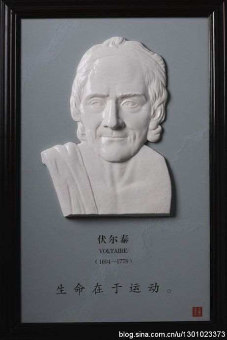 德化瓷塑,自何朝宗始,作品造型形態(tài)優(yōu)美、衣褶組合富有韻律和節(jié)奏,仿佛行云流水,動(dòng)靜得宜。充分體現(xiàn)了中國(guó)傳統(tǒng)雕塑的美感,同時(shí)又以著意塑造人物的精神內(nèi)涵為能。林建全不僅很好地繼承了何朝宗瓷塑的優(yōu)秀傳統(tǒng),并且注重將傳統(tǒng)技法與現(xiàn)代理念相融會(huì),塑造出不少具有現(xiàn)代人文價(jià)值和審美情趣的作品,從而實(shí)現(xiàn)了對(duì)德化傳統(tǒng)瓷塑的豐富和突破。他創(chuàng)作的《世界名人肖像浮雕》《十大元帥浮雕》《偉人毛澤東塑像》等系列作品,不僅形準(zhǔn)(都做得很像),并且讓人能感覺(jué)出不同名人的不同精神“氣場(chǎng)”:睿智幽默的愛(ài)因斯坦、犀利深刻的托爾斯泰、不屈不撓的貝多芬、淡定自信的居里夫人......既見(jiàn)“真象”,又顯真魂,俱各恰到好處。而我最欣賞的作品是浮雕《伏爾泰》。