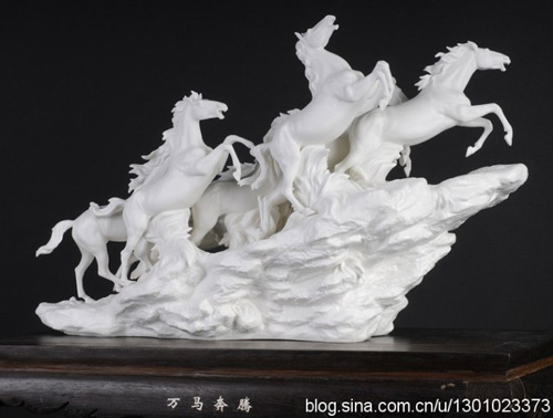20多年來(lái), “瓷塑狂人”林建全共做過(guò)多少瓷塑?沒(méi)有誰(shuí)算過(guò),恐怕連他自己也說(shuō)不清。他的工作室不是一間,不是一層樓,而是一棟四層樓,每層都有許多間;他的作品不是一件一件出爐,而是一批接一批,一個(gè)系列一個(gè)系列地涌出!而無(wú)論是成批還是成系列,都是一件一件靠自己手工做出來(lái)的,而非復(fù)制成型。比如,他做的《世界近200幅名人肖像浮雕》系列,光聽(tīng)這名稱(chēng)就讓人瞠目!200位名人,200張不同面孔,都是人們熟知的,怎么可能復(fù)制?還有《十大元帥浮雕》系列、《偉人毛澤東》系列、《開(kāi)心彌勒佛》系列等等,每個(gè)系列一做就是十件、幾十件、上百件!這不但需要精準(zhǔn)的造型功力,需要掌握各種復(fù)雜的工藝技術(shù),還要速度!他的“癡”和“狂” 也體現(xiàn)在這成批成系列產(chǎn)出的速度上。又如,被稱(chēng)為“馬癡”的他給我們打開(kāi)了一個(gè)專(zhuān)門(mén)存放瓷塑馬的陳列室,映入眼簾的,是幾十種神態(tài)飛揚(yáng)的“白瓷馬”,每一匹(或每一組)的造型動(dòng)態(tài)都各不相同!這顯然不是同一模件能夠復(fù)制出來(lái)的!