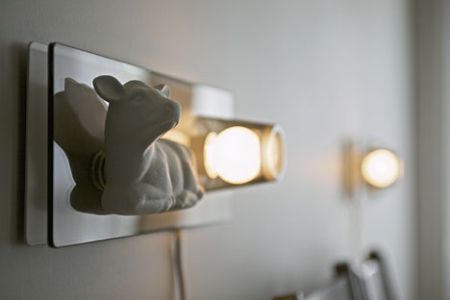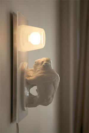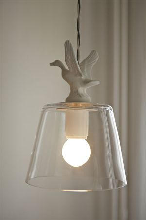 這是一次陶瓷和玻璃的結(jié)合。設(shè)計師為某漁獵俱樂部設(shè)計了這款融合了兩種不同材質(zhì)原料的動物系列燈具,作品中包含吊燈和壁燈,但毫無例外的,都采取了瓷質(zhì)動物形象作為燈具裝飾?梢钥吹剑w禽形象被用于裝飾吊燈,而普通動物形象則被安置在壁燈上,與燈具功用相互呼應(yīng)。
