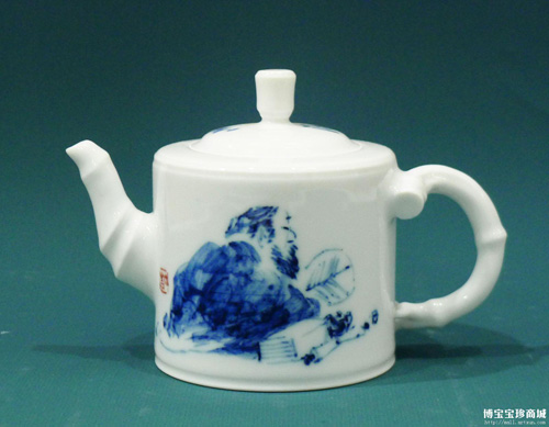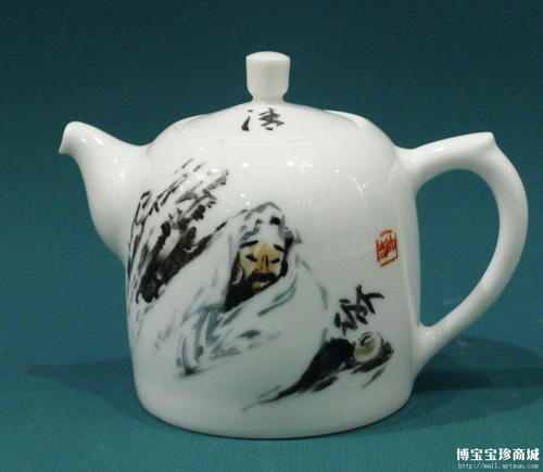 《禪悟》也是以人物為主題的作品。但它是用的釉上彩而并非青花涂料。這件作品色調(diào)以黑白為主,端莊、典雅、大方。壺身上老人的微笑祥和而又溫暖?梢娙宋镄蜗蟮拇┩噶κ侨绱藦(qiáng)大。讓我們?cè)谙硎茏髌窌r(shí)也不由自主的洗禮了心靈。壺身背面的“禪悟”二字凸顯了這件作品的主題,溫和的兩個(gè)字讓我們思想和精神得到升華。壺頂?shù)?ldquo;心”字則又一次強(qiáng)調(diào)了作品對(duì)內(nèi)心的洗滌。樂穹先生的作品正是特點(diǎn)突出,裝飾性、實(shí)用性、收藏性三者合一使得博寶網(wǎng)的藏友和專家們所喜愛,他無(wú)與倫比的作品向我們展示了這個(gè)時(shí)代應(yīng)有的藝術(shù)水平。(博寶藝術(shù)網(wǎng)評(píng)論員 郭強(qiáng) 撰文)