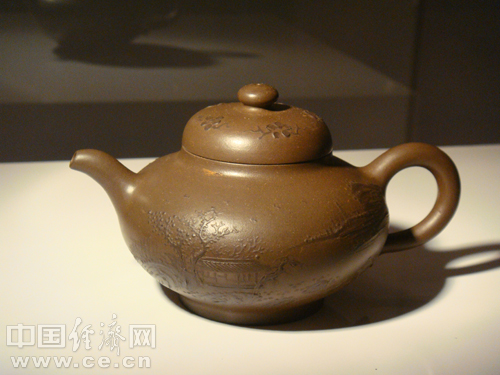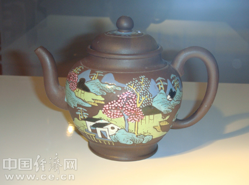 中國宜興陶瓷藝術(shù)深圳展展出6件清代紫砂壺作品,分別是清乾隆年制寬的“泥繪乳鼎壺”,無款“玲瓏八竹壺”、“豐收壺”,綠曾款“描金六角蓮子壺”、清德堂款“點(diǎn)彩宮燈壺”和清嘉慶阿曼陀室款“合歡壺”。圖為泥繪乳鼎壺。