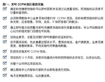 DMGConsulting將實(shí)時(shí)績(jī)效管理定義為以“授權(quán)給部門(mén)經(jīng)理及主管的一套流程,以使他們可以對(duì)正在進(jìn)行的即時(shí)戰(zhàn)術(shù)作出調(diào)整和改善,以達(dá)到部門(mén)和企業(yè)的目標(biāo)。”這比典型的CCPM更具有戰(zhàn)術(shù)性,使聯(lián)絡(luò)中心經(jīng)理及負(fù)責(zé)人即時(shí)控制和評(píng)估坐席員和團(tuán)隊(duì)的行動(dòng)和績(jī)效。這就使快速的調(diào)整對(duì)結(jié)果產(chǎn)生直接的影響。特別是,即時(shí)CCMP的應(yīng)用集中在可以使結(jié)果發(fā)生改變的直接有關(guān)的關(guān)鍵績(jī)效指標(biāo)上。其中一些關(guān)鍵績(jī)效指標(biāo)包括:平均的回答速度,按時(shí)執(zhí)行的能力,電話(huà)量,等待時(shí)間,平均交談時(shí)間,占有率,每個(gè)坐席員的收入,銷(xiāo)售轉(zhuǎn)換率,資金收集及資金保證。即時(shí)CCPM通過(guò)提示及預(yù)警指示坐席員,團(tuán)隊(duì)及聯(lián)絡(luò)中心的行動(dòng),并且經(jīng)常在15秒,甚至是更短的時(shí)間內(nèi)進(jìn)行更新。