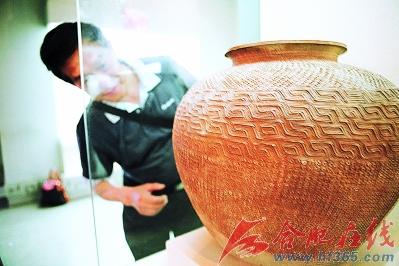展品中距今年代最為久遠的是兩件新石器時期的彩陶壺。列為第一件展品的“石嶺下文化彩陶壺”,泥土黃,倒像個泥罐,唯一的彩色是兩條黑色蛇的彩繪,對稱纏繞在一起,蛇的眼睛瞪得老大,非常有氣勢,讓人一看到彩陶罐就不由自主地盯著蛇眼看。省陶瓷協(xié)會的愛好者許國說,這個作品代表新石器時期早期馬家窯文化。另外,還有一個代表新石器時期中期半山文化的“雙耳彩陶侈口壺”,也是用黑色彩繪描繪出簡單的花紋圖案。