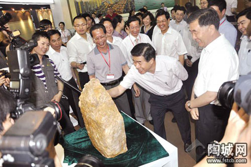 廣東省委書記汪洋、省長(zhǎng)黃華華等細(xì)致觀摩嘉俊陶瓷皇室御品“酒黃寶石”(譚瑞源 攝)