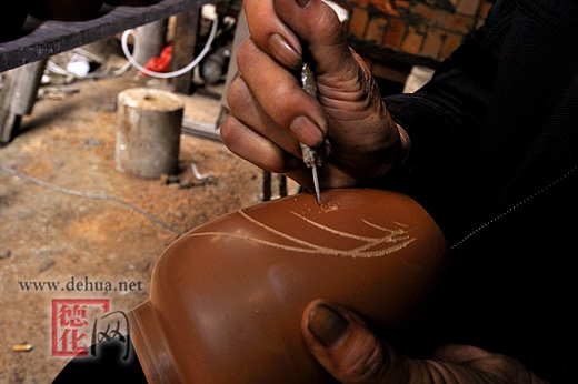 顏義哲和臺灣客商洽談的生意,短期就交易結(jié)束,但他卻從此喜歡上在陶坯上刻畫的藝術(shù),而且,這一堅(jiān)持就是二十幾年。如今,刻畫技藝越來越嫻熟的他,不用在陶坯上用筆勾畫輪廓,就能將腦海中構(gòu)思好的圖案一氣呵成地刻在陶坯上。