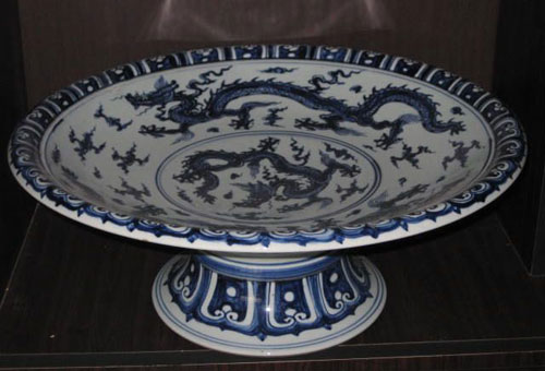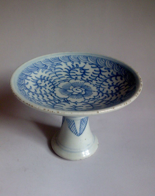 高足盤:南北朝、隋代瓷器常見的一種盤式。器型有大、中、小之分。一般造型為淺盤式,口沿外撇,盤心平坦,常有陰線圈紋,留有3個(gè)、5個(gè)或7個(gè)不等的支燒痕跡,下承以空心喇叭狀高足。