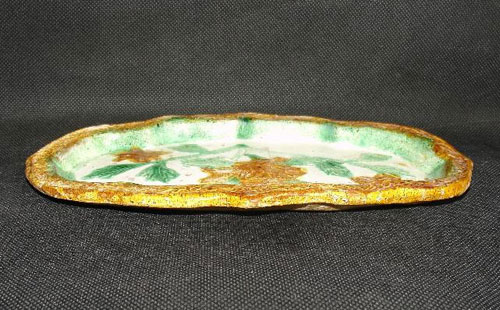 海棠式長(zhǎng)盤:遼瓷典型器之一,因全器若海棠花形而得名,盤面較扁長(zhǎng)、折沿、淺腹、平底,多以三彩印花裝飾。瓷制品源于木制餐具。這種器物也常見于遼墓壁畫。