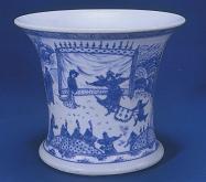 康熙青花使用的是極為純凈的云南珠明料,呈純藍(lán)色,濃淡層次多而分明,故稱“康熙五彩”,此器就具有這一典型特點(diǎn)。高13.5cm,直口,筒腹,玉璧底。腹部主題紋飾為元代戲劇故事圖,配以詩文。其繪畫特點(diǎn)受中國畫的影響,采用層層涂染的技巧,所繪人物用披麻皴法,線條纖細(xì)有力,生動自然。青花色調(diào)鮮麗,層次多而清晰,充分反映了這一時期青花的典型特征。