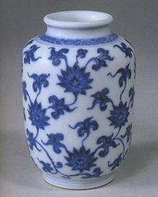 罐高11.1cm,唇口,細(xì)頸,斜肩,筒腹,圈足。肩部飾卷草紋一周,腹部飾纏枝番蓮。青花色澤濃艷,頗有永樂(lè)、宣德青花之味。紋飾疏朗,線條流暢,釉澤明亮。底有“大清雍正年制”六字款。