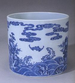清代雍正時(shí)期制瓷技術(shù)已達(dá)到歷史最高水平,以精細(xì)著稱于世,此筆筒是典型的代表作之一,高15.5cm,,直口,筒腹,玉璧底。主題紋飾是寓意福壽吉祥的蝙蝠、靈,襯以竹石、江岸波濤、云紋,構(gòu)成一幅“壽山福海圖”。繪畫線條纖細(xì),構(gòu)圖疏朗,簡(jiǎn)潔清晰。胎質(zhì)潔白,釉面瑩潤(rùn),器面光凈。青花色澤青翠柔和,色調(diào)具有暈散,系仿明代宣德青花的效果。造型俊秀,工麗嫵媚。