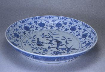 瓷盤徑50.3cm,敞口略內(nèi)斂,平底,圈足,外為白砂底。器內(nèi)  沿繪一周折枝蓮花紋,內(nèi)壁為纏枝蓮花,底飾雀桃  竹圖案,外壁繪滿海水波濤紋。繪畫模仿宣德時(shí)期  的風(fēng)格,但又有它獨(dú)特的清秀典雅的特色,用筆趨  于纖柔,畫面細(xì)膩富麗,構(gòu)圖嚴(yán)謹(jǐn)。青花色調(diào)濃艷  明快,有別于宣德時(shí)期的特征。