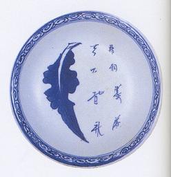 盤徑14cm,口微折,弧壁坦心,圈足。低下口沿飾醬色釉,內(nèi)心用青花繪葉脈清晰的葉紋,旁邊書有行書“梧桐葉落,天下皆秋”。圈足內(nèi)書有“大清丁未年制”六字雙行款,“丁未’’是康熙六年(公元1667年)。