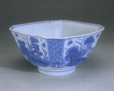 該方碗口徑為14.8*14.4cm,侈口,方棱形口沿,腹呈方形,固足。腹部四面繪有表示祝福與象征吉祥的梅樹、菊花、牡丹、荷花,襯以山石花草,四棱角處配飾幾何錦地紋,下為如意云頭紋,器內(nèi)底方框內(nèi)繪蘭草花卉。繪畫工整,題材豐富,畫意深遠。青花色調(diào)淺淡,造型獨特,是康熙中期民窯青花的典型代表。