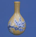 瓶高19.5cm,直口,短頸,溜肩至腹部漸鼓,腹下內(nèi)收,圈足較矮。因其形如懸掛的苦膽,又稱“膽式瓶”。瓶腹的主題紋飾為梅花喜鵲紋,瓶體施董釉,釉面有細(xì)碎開片。以鉆藍(lán)料在黃釉上進(jìn)行繪畫,用青花勾出梅花紋,填以乳白色彩料,再施透明玻璃質(zhì)釉,因此有紋飾的地方微凸。