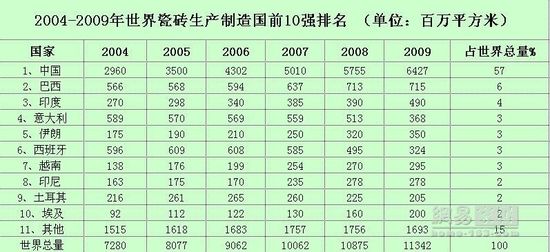 很多陶瓷企業(yè)認(rèn)為國(guó)內(nèi)陶瓷市場(chǎng)面臨產(chǎn)能過(guò)剩,是導(dǎo)致今年陶瓷市場(chǎng)遭遇“艱難”時(shí)期的原因之一。中國(guó)建筑衛(wèi)生陶瓷協(xié)會(huì)統(tǒng)計(jì)數(shù)據(jù)顯示2009年我國(guó)瓷磚的總產(chǎn)量是64.27億平方米。中國(guó)建筑衛(wèi)生陶瓷協(xié)會(huì)副秘書(shū)長(zhǎng)尹虹表示2010年我國(guó)的瓷磚總產(chǎn)量已經(jīng)超過(guò)了75億平方米,我國(guó)2010年人均陶瓷磚表觀消費(fèi)量[(年產(chǎn)量-出口+進(jìn)口)/人口]已經(jīng)超過(guò)5平方米,已經(jīng)處于世界高位,明顯超過(guò)絕大多數(shù)的世界瓷磚生產(chǎn)制造消費(fèi)大國(guó)。