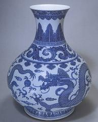 該瓶高57cm,侈口,長(zhǎng)頸,鼓圓腹,下收斂,足外撇。肩部、頸部飾卷草紋、如意云紋和蕉葉紋。腹部繪兩條粗壯威猛的云龍,在飄帶形火焰紋和壽山福海的點(diǎn)綴下,大有四海翻騰、沖天入地、叱咤風(fēng)云之氣勢(shì)。秀美穩(wěn)重的器物造型,晶亮瑩澈、藍(lán)中泛紫的釉色,代表著雍正時(shí)期的制瓷工藝水平。瓶底有“大清雍正年制”青花篆書(shū)款。