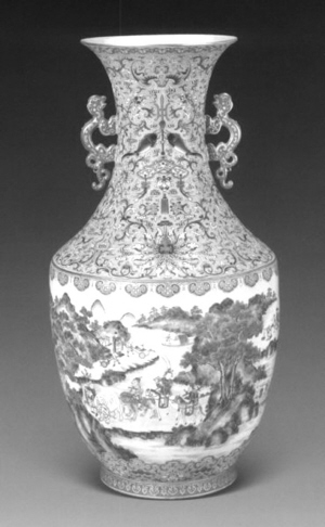 乾隆時(shí)期,粉彩盛行,色彩濃艷明麗,紋飾繁縟,盡顯御用瓷器的奢靡之風(fēng)。而嘉慶官窯瓷器就像嘉慶帝本人性格一樣,只會沿襲乾隆時(shí)期的舊制,紋飾多采用傳統(tǒng)圖案,繪制技法則工筆多于寫意,燒造大件器物增多,而且形體高大,不因胎體厚重而變形,器形端莊,依然顯示出傳承一脈的乾隆晚期高超制瓷工藝。所謂“父子相傳,乾規(guī)嘉隨”而已。