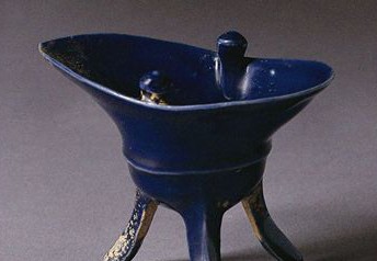 敞口,口面呈葉形,一端尖,一端圓。杯口左、右內(nèi)側(cè)中心處有高出沿口1.1cm的乳頭柱。外腹腰部凸飾弦紋。三足呈三棱形,向外撇開。釉質(zhì)腴潤,呈色鮮艷如金石藍。腹外底部及三足內(nèi)側(cè)上半部均未施釉。