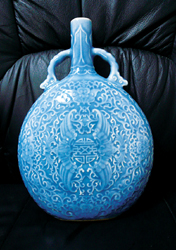 提起孔雀藍釉瓷,人們便會想起2004年香港蘇富比的春季藝術(shù)品拍賣,此場拍賣的重頭戲是286號明宣德孔雀藍釉盤,1238.24萬港幣的拍賣成績,成為單色釉瓷器拍賣的最高紀錄。這只天價盤子原屬英國鐵路退休基金會,記錄良好,品相極佳,盤形優(yōu)美。器壁暗刻花紋,盤底青花雙圈六字官款。孔雀藍釉發(fā)色均勻鮮艷,專家坦言:就明代早期瓷器的燒造水平而言,此類品種在世界上存世量不超過十件,實屬絕代珍品。