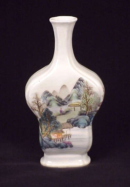 所謂洪憲瓷,即落有“洪憲年制”或“洪憲御制”款識的瓷器。北京藝術(shù)博物館收藏有數(shù)件此類款識的瓷器,如一件粉彩人物紋瓶,口徑10.1厘米,底徑10.3厘米,高27.7厘米,腹圍50厘米。造型為撇口,短頸,溜肩,長圓腹,圈足?谘孛杞,口內(nèi)施松石綠釉。器身通景繪粉彩山水人物紋,題名為“淵明愛菊”。底亦施松石綠釉,書紅彩“洪憲年制”四字楷體雙方框款,款識工整。