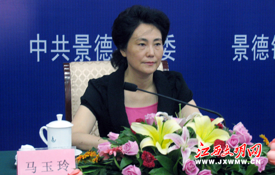 景德鎮(zhèn)市委常委、宣傳部長馬玉玲現(xiàn)場介紹此次陶瓷精品布展情況。
