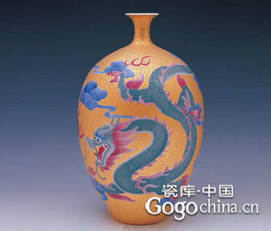 圖:二龍戲珠釉下五彩陶瓷葡萄花瓶