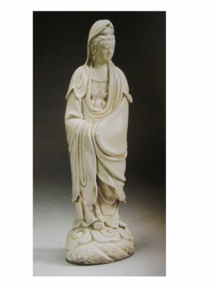 在德化窯歷代作品中,明代的“象牙白”最美,“象牙白”作品中,瓷塑最精。吳仁敬、辛安潮著《中國陶瓷史》敘述:“白建似定窯,無開片,質(zhì)若乳白之滑膩,宛若象牙,光色如絹,釉水瑩厚,以善制佛像著名,如如來、彌陀、觀世音、菩提、達(dá)摩等,皆精品也。明季自寧波流入日本,日本商人甚至不惜以萬金購之,足見其精美矣。”德化窯瓷塑以人物著稱,題材有觀音、如來、達(dá)摩、八仙、壽星、羅漢、文昌帝、多臂準(zhǔn)提等等,形象傳神,衣紋簡練、線條流暢,制作技法有模制和捏塑兩種。