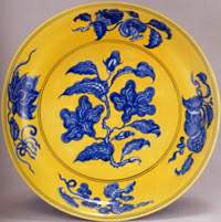 黃釉青花器以明中期的黃釉青花花果紋盤最為有代表性,明晚期并不多見,在清三代多有仿制,其中康熙、乾隆兩朝仿制的最像。青花花果紋盤有兩種基本裝飾紋樣,盤內(nèi)壁畫荔枝、枇杷的,盤心畫石榴花一枝, 外壁畫番蓮花;盤內(nèi)壁畫石榴、葡萄的,盤心畫玉蘭花一枝,外壁畫牡丹花。這種把黃藍兩種色調(diào)共存于一種器物上的藝術(shù)品更受當(dāng)今收藏家的喜愛。在目前的拍賣中,有數(shù)據(jù)可查的黃釉青花器只有兩件拍器,但都以高價成交,且都在四年以前成交,而近四年來并不見有黃釉青花器現(xiàn)身拍場。據(jù)估計,1996年翰海秋拍中以286萬元成交的明弘治黃釉青花花盤目前的市場價值至少在千萬元以上。