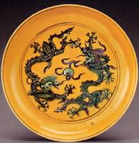 黃釉在明清兩代皇室中的使用是有規(guī)定的,不是任何人都可以使用的。據(jù)史料考證,在明代皇宮中,器里外都施黃釉的瓷器為皇太后、皇后的用具;皇貴妃則用器物內(nèi)壁為黃釉,外壁為普通透明釉的器物,貴妃用黃釉綠龍器或黃地綠 龍器;嬪妃用藍地黃龍器;貴人則不可以用黃釉器。因此我們在投資黃釉瓷的過程中,對認知黃釉瓷的種類很重要。不同的黃釉瓷代表不同的等級,但我們同時還要從稀有性上進行投資,比如一些黃釉彩瓷,在黃釉彩瓷中,綠彩瓷價格略低外,而其它黃釉彩瓷級別雖低,但因存世量有限,在藝術(shù)品市場中并不多見,且工藝繁瑣反而價高一些。